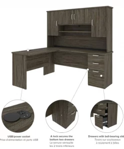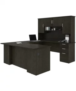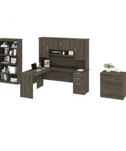 Bestar Murzim 71W U-Shaped Executive Desk with Hutch, Lateral File Cabinet, Bookcase in walnut grey