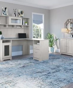 Bush Furniture Cabot L Shaped Desk W/ Hutch and Small Storage Cabinet W/ Doors, Linen White Oak