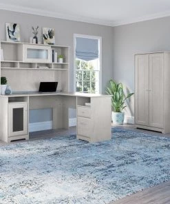 Bush Furniture Cabot L Shaped Desk W/ Hutch and Tall Storage Cabinet W/ Doors, Linen White Oak