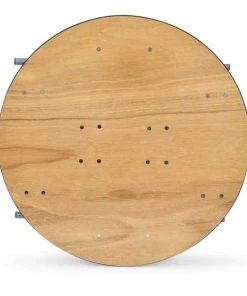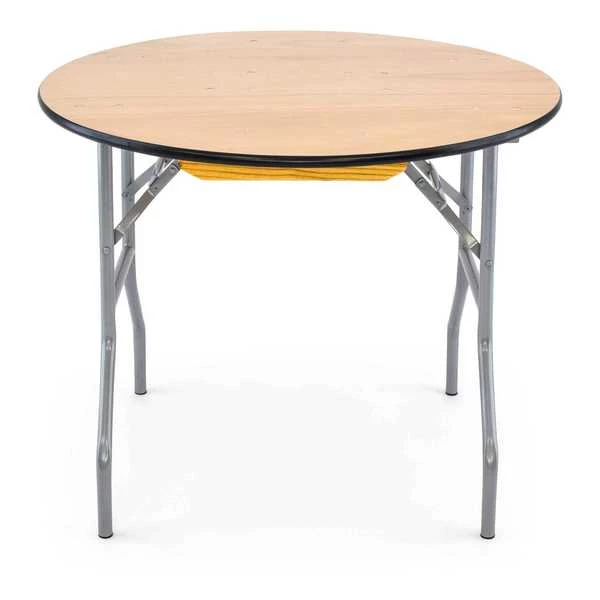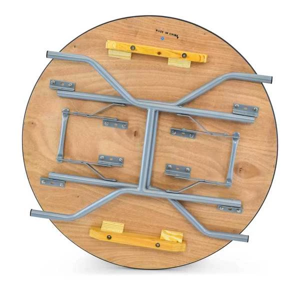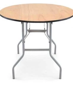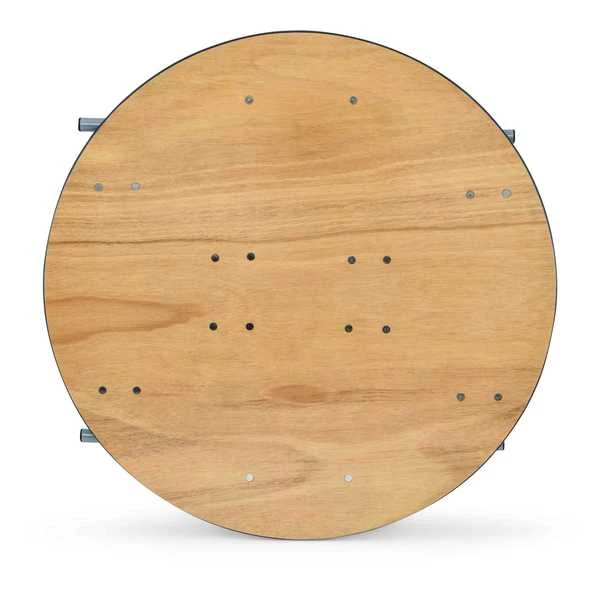 36" round, 30" inch wood folding table. UV resistant polyurethane on the top and bottom of the table. 3/4" 12-ply plywood with vinyl bullnose edging that is glued and nailed into the table