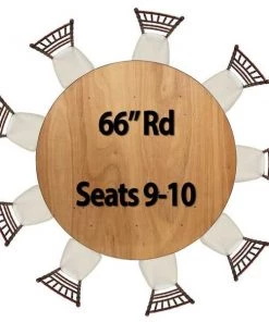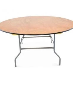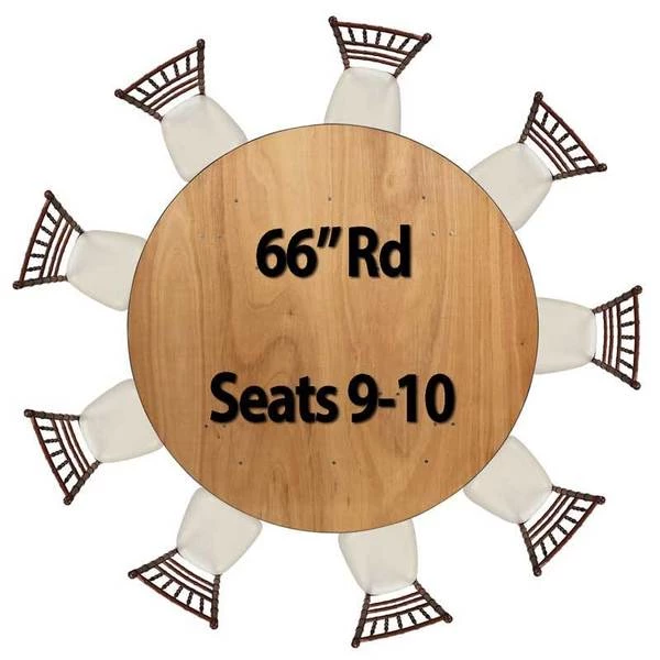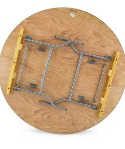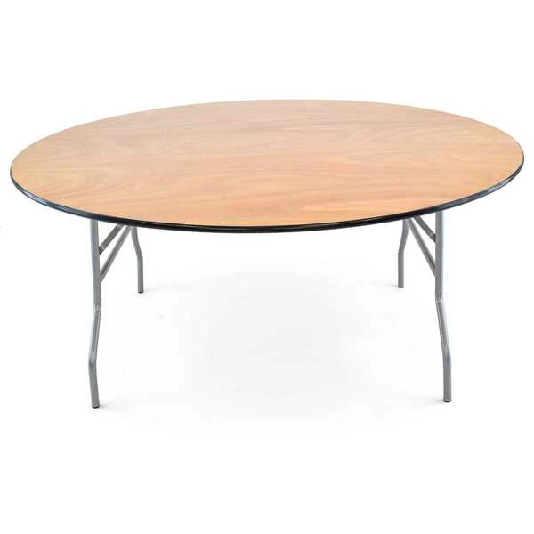 66" round, 30" inch wood folding table. UV resistant polyurethane on the top and bottom of the table. 3/4" 12-ply plywood with vinyl bullnose edging that is glued and nailed into the table