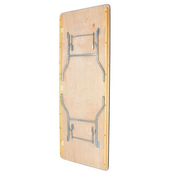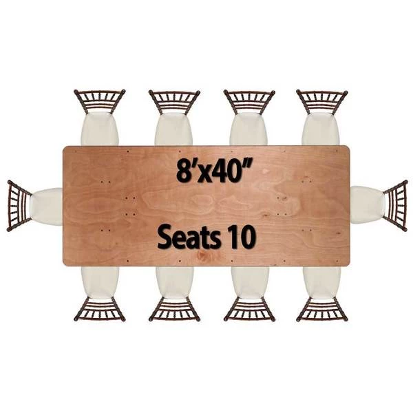 8' x40" inch wood folding queen banquet table. UV resistant polyurethane on the top and bottom of the table. 3/4" 12-ply plywood with vinyl bullnose edging that is glued and nailed into the table