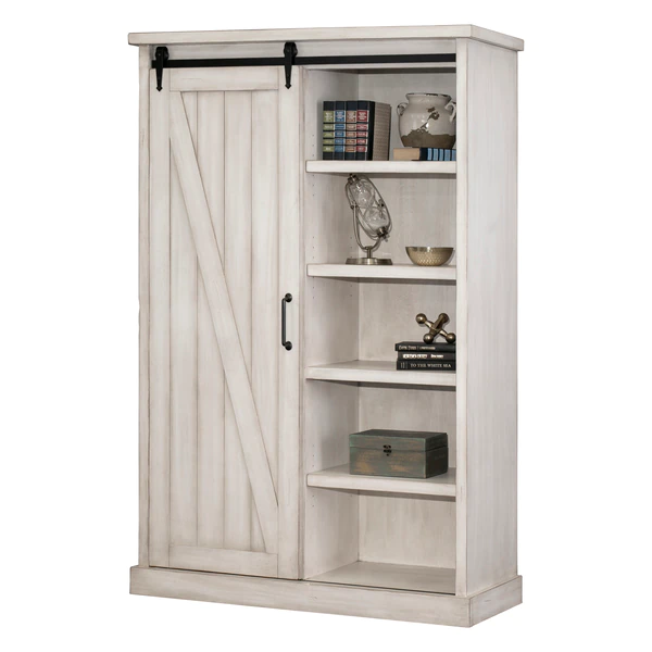 The Avondale bookcase speaks to simplicity with its hand applied weathered white finish. Mortise and Tenon details, steel rails, exposed wheels, and a distressed finish help deliberately highlight the age and beauty of the piece. It has a basic barn door style with heavy plank tops and timber legs. Avondale's classic look with rustic wood and authentic hardware has clearly withstood the test of time. The bookcase includes one sliding door, four adjustable shelves and one fixed shelf. Arrives fully assembled.