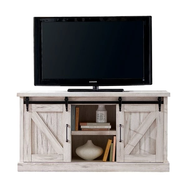 The Avondale credenza speaks to simplicity with its hand applied weathered white finish. Mortise and Tenon details, steel rails, exposed wheels, and a distressed finish help deliberately highlight the age and beauty of the piece. It has a basic barn door style with heavy plank tops and timber legs. Avondale's classic look with rustic wood and authentic hardware has clearly withstood the test of time. The console includes two sliding doors, three fixed shelves, and three adjustable shelves. Arrives fully assembled.