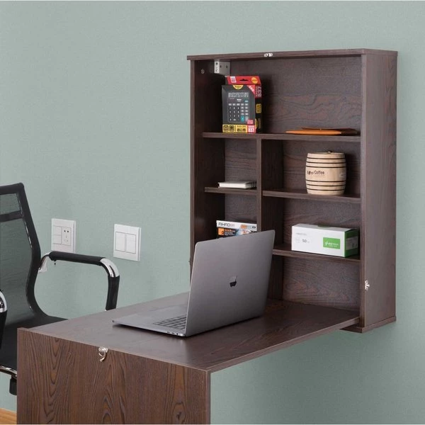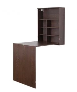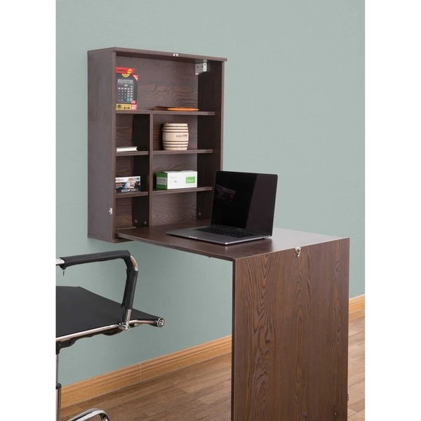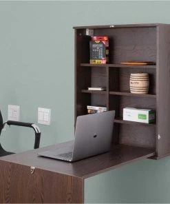 Add extra working space with this folding wall mounted desk. Multi functional use includes as an office desk, kitchen working area or table, and bedroom working space. Composed out of durable wood, this desk offers a sturdy base to hold office essentials neat and organized. Plenty of shelves provides extra space to store office, bedroom, or kitchen items and trinket display. Foldable design allows you to save up on space and hide storage when not in use. This is how practical working is done. Work, store, and fold.