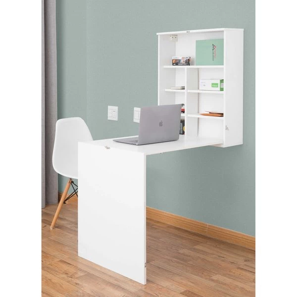 Add extra working space with this folding wall mounted desk. Multi functional use includes as an office desk, kitchen working area or table, and bedroom working space. Composed out of durable wood, this desk offers a sturdy base to hold office essentials neat and organized. Plenty of shelves provides extra space to store office, bedroom, or kitchen items and trinket display. Foldable design allows you to save up on space and hide storage when not in use. This is how practical working is done. Work, store, and fold.