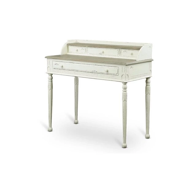 Boasting a white-streaked and distressed finish plus plenty of storage space via four drawers and a well-positioned shelf, our Anjou Traditional French Accent Writing Desk combines flair and utility. The genuine mindi-wood tops feature a white-streaked natural veneer that pairs perfectly with the distressed white finishing that comprises the remainder of this writing desk. The wooden drawer handles maintain the stylistic stance to perfection.