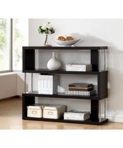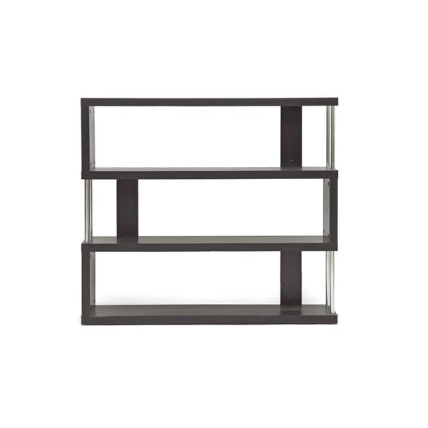 This artsy, modern bookcase gets you organized with style. Our Barnes Bookcase is made of dark brown faux wood grain paper veneer over and engineered wood frame and features chromed steel side supports. Not only does this modern display shelf house books, but it is also the perfect place to show off your prized vases, décor, and home accents. The Barnes Bookcase requires assembly, and should be dry dusted. Separately offered is the Barnes Bookcase with six shelves. 38 inches high x 43 inches wide x 11 inches deep