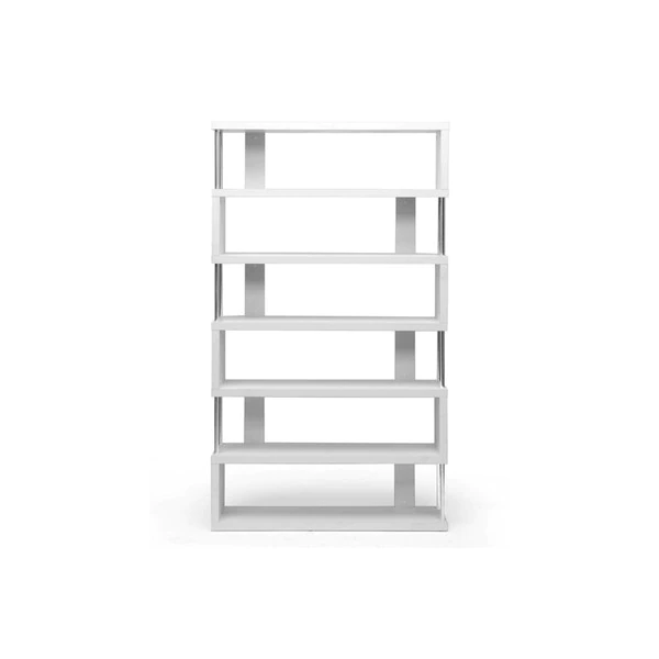 This artsy, modern bookcase gets you organized with style. Our Barnes Bookcase is made of white paper veneer over an engineered wood frame and features chromed steel side supports. Not only does this modern display shelf house books, but it is also the perfect place to show off your prized vases, décor, and home accents. The Barnes Bookcase requires assembly, and should be dusted with a dry cloth. Separately offered is the Barnes Bookcase with three shelves as well as the Barnes Bookcase in dark brown. Dimensions: 75.2 inches high x 43.3 inches wide x 11.4 inches deep