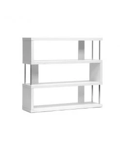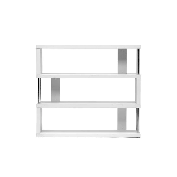 This artsy, modern bookcase gets you organized with style. Our Barnes Bookcase is made of white paper veneer over an engineered wood frame and features chromed steel side supports. Not only does this modern display shelf house books, but it is also the perfect place to show off your prized vases, décor, and home accents. The Barnes Bookcase requires assembly, and should be dusted with a dry cloth. Separately offered is the Barnes Bookcase with six shelves as well as the Barnes Bookcase in brown. 38 inches high x 43 inches wide x 11 inches deep