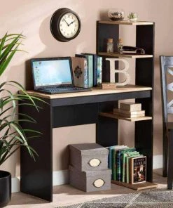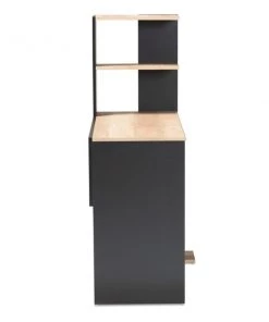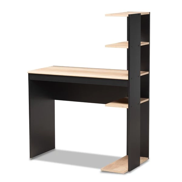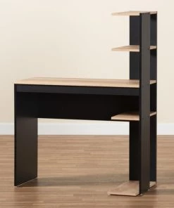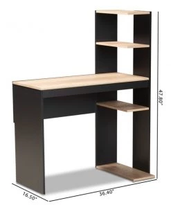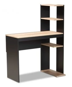 Add a modern touch to your office space with the excellent Callahan desk. Made in Malaysia, the Callahan is comprised of sturdy wood showcasing a striking two-tone finish of dark grey and oak for a cool, sleek look. Four shelves located at the side provide convenient storage space for electronics, supplies, and decorations. Requiring assembly, the Callahan features an open back for easy cord management. Steeped in contemporary style, the Callahan desk is an exceptional addition to any modern office space.