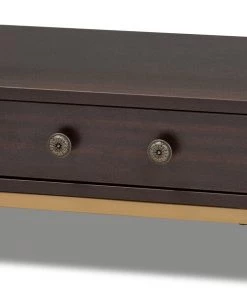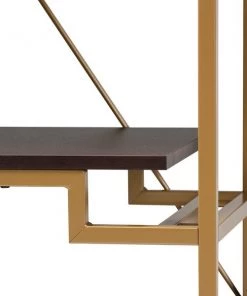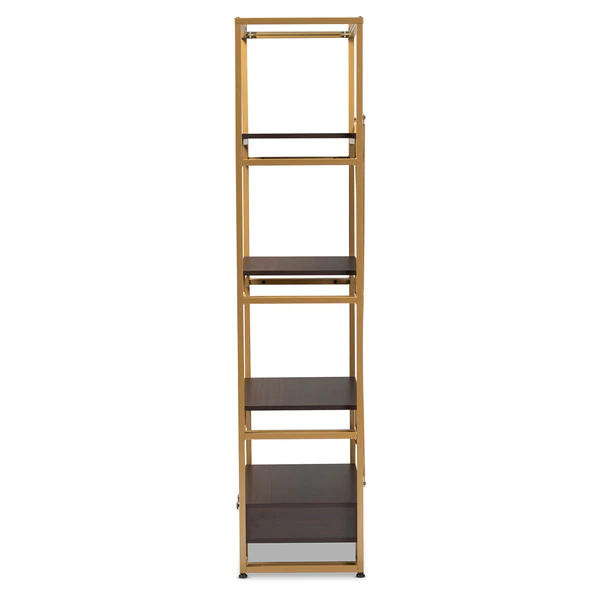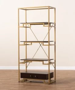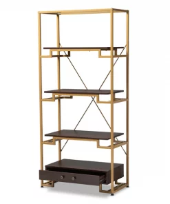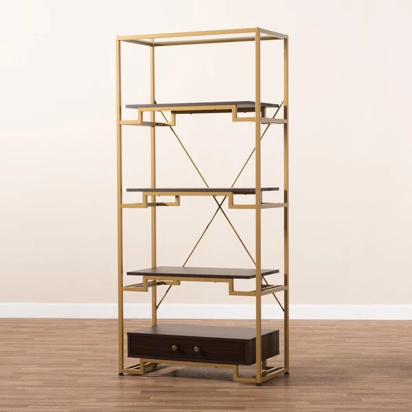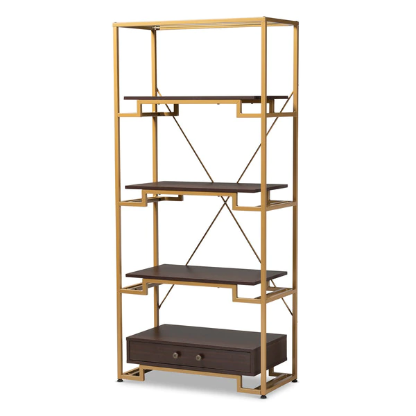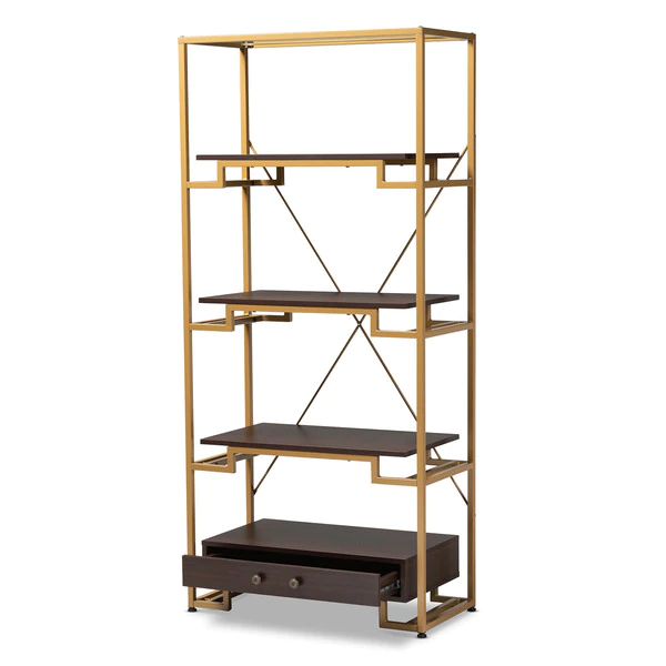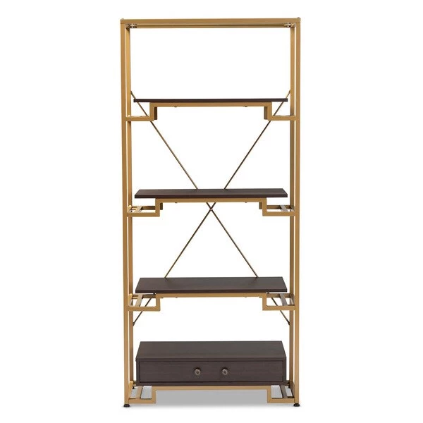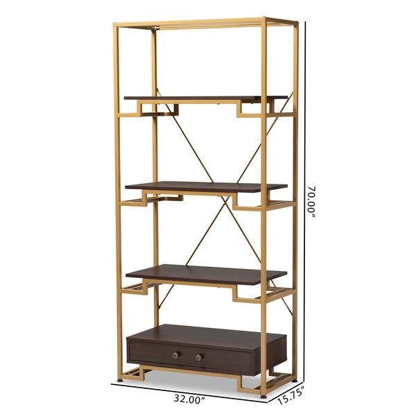 Showcase all of your favorite books and decorative items with the Cerelia accent bookcase. The glamourous gold-tone steel frame features a sleek step design, adding visual interest to your living room. Three dark wood shelves provide ample space to display decor and plants, while a spacious dark wood drawer offers concealed storage space. Antique gold-tone, embellished metal drawer knobs add a decorative touch. Designed with both style and utility in mind, the bookcase features a crisscross stretcher on the back for structural support. The Cerelia accent bookcase requires assembly.