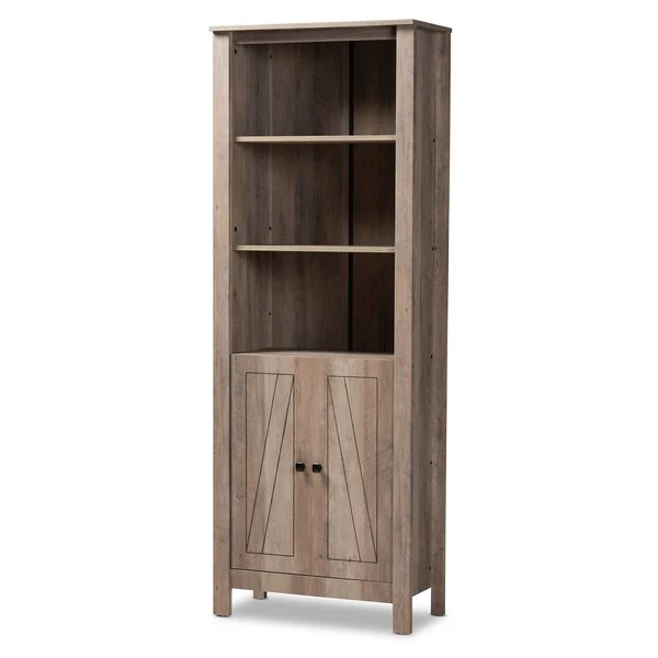 Crisp lines create a sleek silhouette in the stunning Derek bookcase. Made in Malaysia, the Derek is constructed from sturdy wood showcasing a natural oak finish. Three external shelves provide an excellent display for books or decorations, while two internal shelves supply concealed storage space. Requiring assembly, the doors feature an exquisitely carved design, as well as black finished square metal knobs for added visual appeal. A stylish way to organize and display collections, the Derek bookcase is an excellent addition to any space.