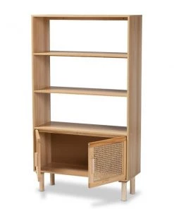Expand the borders of your interior with the fantastic convenience of the Faulkner bookcase. Made in China, this handy piece is comprised of a sturdy wood frame accented with rattan. Three open shelves create a stunning display for knickknacks, collectibles, and decorations while a large shelf behind the doors offers more secure storage space. Requiring assembly, the Faulkner is supported by rounded legs for excellent stability and support in mid-century inspired design. An exceptional blend of modern convenience and retro design, the Faulkner bookcase enriches any space.This is a product of nature and may have variations in areas such as, but not limited to, color, pattern, grain and texture. The hair-like strands of rattan/rattan-fiber are common due to nature of the material.