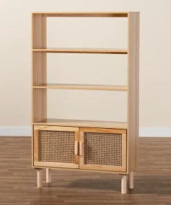 Baxton Studio Faulkner Mid-Century Natural Brown Finished Wood and Rattan 2-Door Bookcase