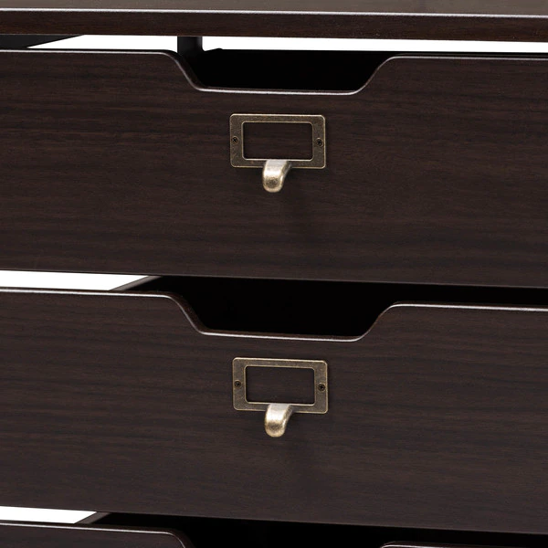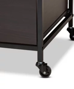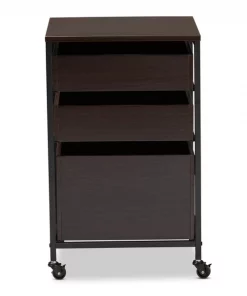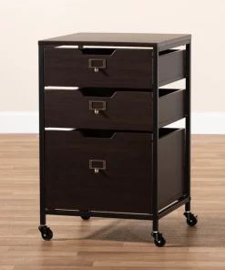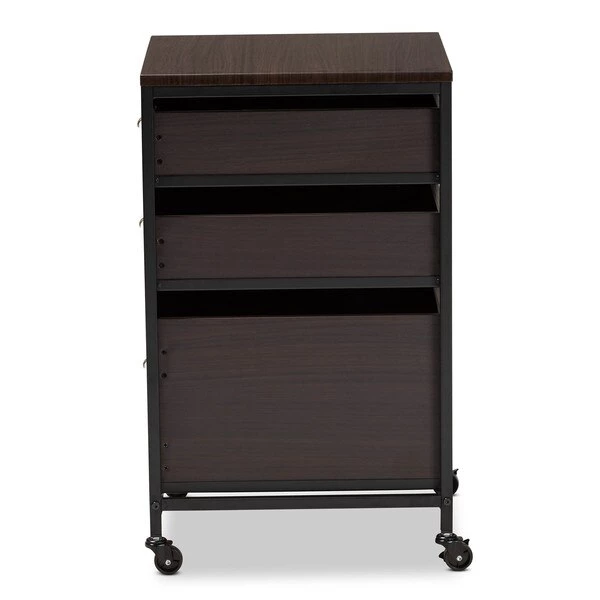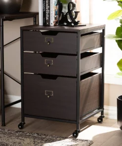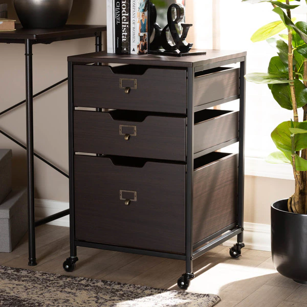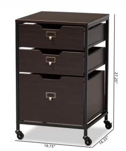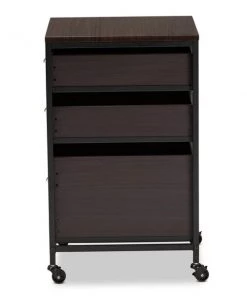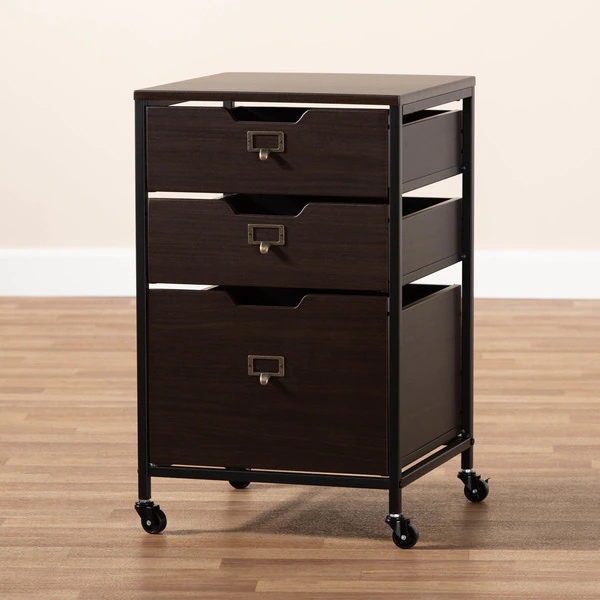 Keep all your documents organized and close at hand with the Felix file cabinet. Three drawers provide storage space for papers, folders, and more. Each drawer is adorned with a charming vintage style brass tab. Caster wheels enable smooth mobility and can be locked to keep the cabinet securely stationed. Constructed from sturdy black steel and MDF wood with dark brown polyurethane veneer, the Felix is suitable for both a professional and home office setting. The Felix file cabinet requires assembly.