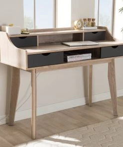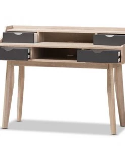 A perfect blend of classic and modernity, the Fella collection showcases pattern played with clever balance of colors and sleek surface. Constructed of engineered wood in oak and grey two-tone finishing, the Fella 4-drawer study desk reveals a fresh and relaxing look. Angled legs complements the piece of furniture for superior support and style. Four drawers open to reveal storage room for stationery and the two open shelves make room for books and magazines. Elevated rims allow the use of the top surface as display space for your décor. With practicality, the drawers with cut-out handles in grey wood finish contrast with the oak surface for a contemporary, Scandinavian aesthetic in your home. The Fella 4-drawer study desk requires assembly.