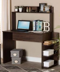 Complete your office space with the exceptional Garnet desk. Made in Malaysia, the Garnet is comprised of sturdy wood showcasing a warm walnut brown finish. Three shelves at the side provide convenient storage, while three additional shelves on top create an eye-catching display for decorations. Requiring assembly, the Garnet features an open back for easy cord management. With an ergonomic design steeped in modern style, the Garnet desk enhances any personal office space.