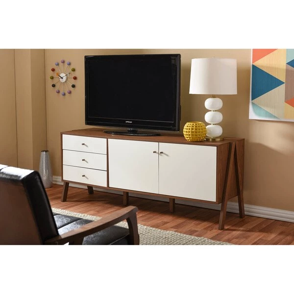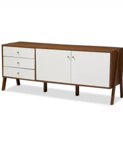 Highlight the handsomely modern feel of your space with the superior storage and Scandinavian style of the Harlow Sideboard Cabinet. Made from sustainably sourced engineered wood and sturdy rubber wood legs with lasting quality, the sideboard is finished in white and walnut two tone PU veneer. The two doors open to reveal internal shelving that's ideal for storage with three additional drawers on the left. Angled legs complement the white-and-walnut contrast tones for a design steeped in retro, Scandinavian style. Streamlined style-lines for a contemporary design that works well with a range of interiors, from mid-century to modern and from Scandinavian to Hamptons or urban loft, the Harlow will provide ample storage and style to your entryway or living room for practicality. The Harlow requires assembly.