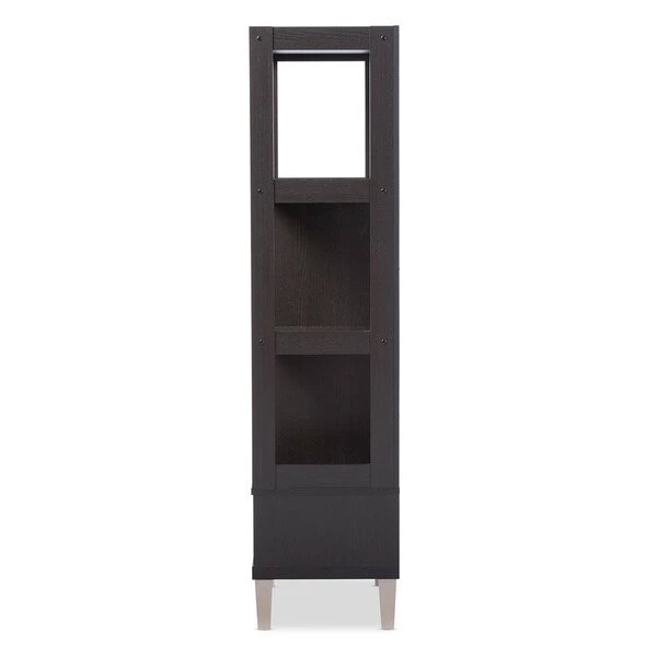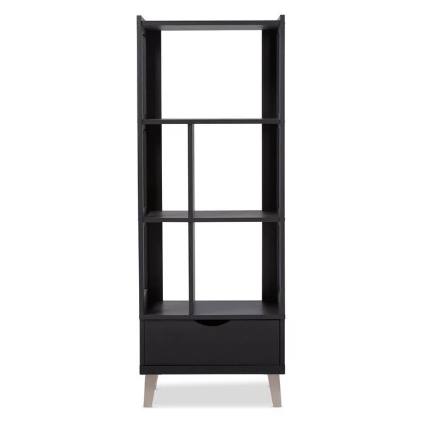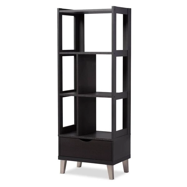 Simple and architectural, the Kalien Dark Brown Wood Leaning Bookcase is reminiscent of modern and contemporary design. The Kalien’s clean and functional design features powder coated vinyl legs supporting the framework of the bookshelf. A generous sized storage drawer, two smaller open shelves, two larger open shelves and one large horizontal spanned shelf are built in providing storage solution for a better living. Crisp, clean lines and finger grooves drawer give the shelf an effortless character and charm. The bookshelf, constructed of engineered wood and finished in dark brown finishing will match with your modern interior decor. The Kalien, could be placed in your living room or home office, provides ample storage space for your display items, books, pictures and accessories. The study desk requires assembly.