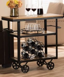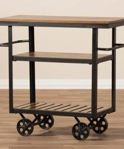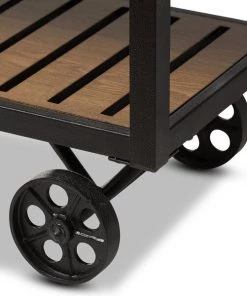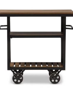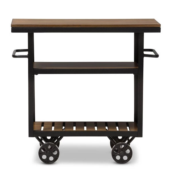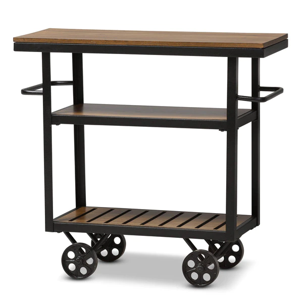 Roll this rustic kitchen island cart anywhere you need storage, counter space or a work area. Constructed of tubular metal in antique black textured finishing frame and distressed oak wood frame, the Kennedy offers a solid structure for years to come. Slatted shelf at the bottom offers the storage of highball glasses and full-bodied blends while the middle shelf fit for plates and utensils. The upper top provides a large surface while you are serving your guests while four antique reproduction wheels offer mobility to place this bar cart anywhere it is needed. Two towel bars offer added function to this well-crafted cart. The Kennedy requires assembly.