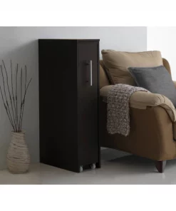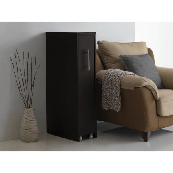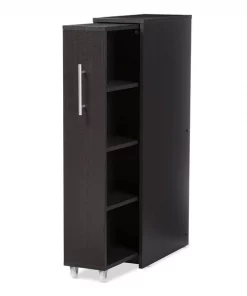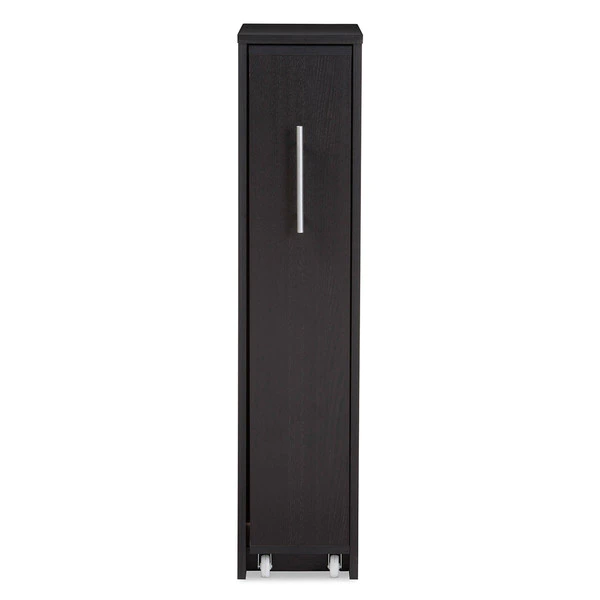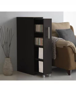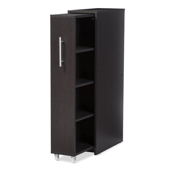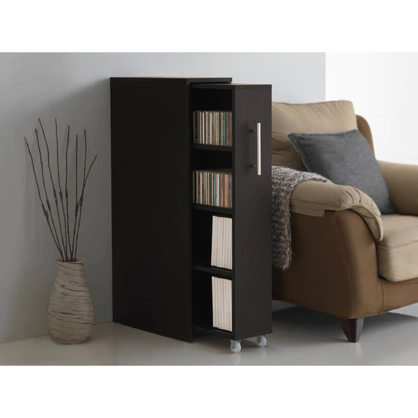 Featuring modern and contemporary design, this fantastic Lindo Dark Brown Wood Bookcase with One Pulled-out Door Shelving Cabinet combines smart storage ideas with style. Constructed of engineered wood, this dark espresso brown bookcase features a pulled door with hidden shelving space. The casters underneath the shelving unit allows flexible pulling out when need be and pulling in when the bookcase is not in. The cabinet helps to keep your books, DVD, CDs and comics out of sight while providing a space saving solution for modern living. To ease the pulling in and out, the pulled-out cabinet comes with a stainless steel handle to add modern look. This mobile book shelf or cabinet could be placed on the side of your couch for easy access or placed by your desk for everyday use. The Lindo requires assembly.