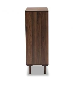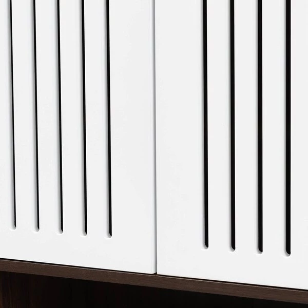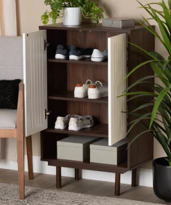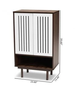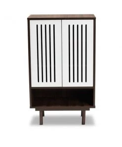 With its modern form and sleek finish, the Meike shoe cabinet is a chic entryway storage solution. This wooden shoe cabinet showcases a two-tone white and walnut brown finish for a cool, contemporary feel. Four shelves provide space to store up to 16 pairs of shoes. Designed for both utility and style, long cut-outs on the doors provide ventilation and convey an ultra-modern look. Requiring assembly, the Meike shoe cabinet elevates any space.