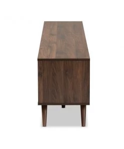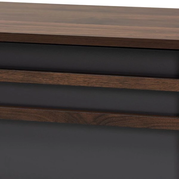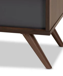 With an ultra-modern, two-tone finish and ample storage space, the Naoki TV stand is sure to make an impression in any space. This wood TV stand features one open shelf, fitted with a cord management hole, to provide space for an entertainment console. Three additional storage compartments are each concealed by a drop-down door. A two-tone grey and walnut finish are paired with long, double vertical handles for a cool, contemporary look. Requiring assembly, the Naoki TV stand is supported by splayed legs that create a chic, retro profile.
