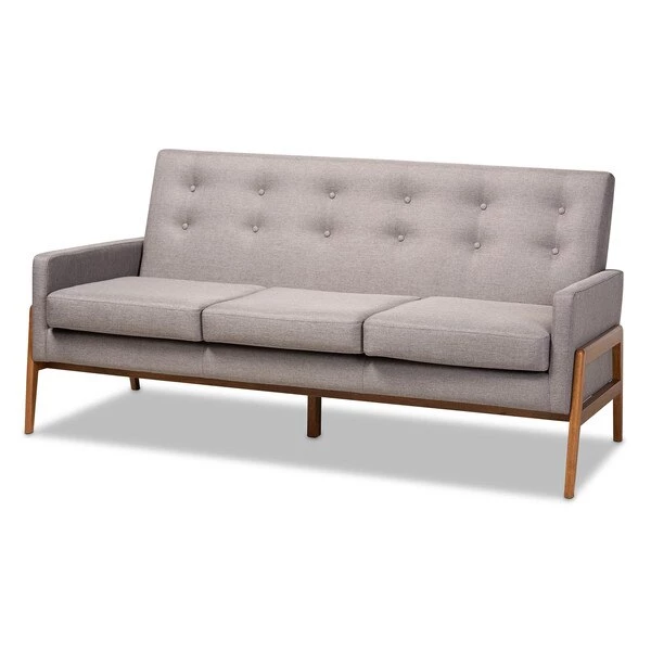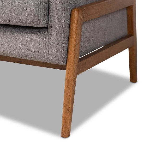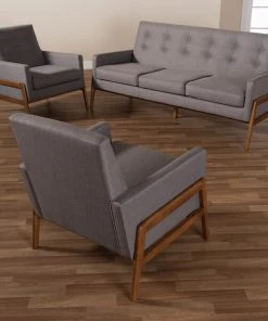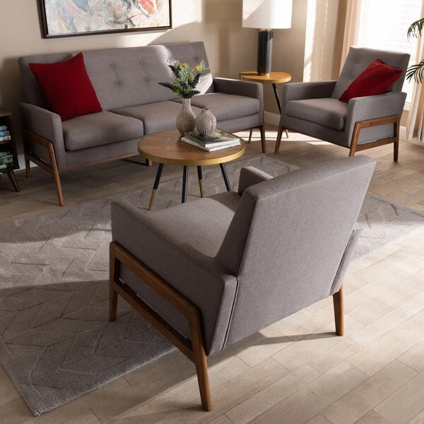 Add modern and comfortable seating to your space with the Perris living room set. Constructed from solid rubberwood, the Perris set includes one sofa and two chairs. Each piece is upholstered in an elegant grey fabric that complements the walnut brown finish on the wood. Wide, plush cushions provide ample seating comfort, while button tufting and angled legs lend a cool, retro look. Stylish and versatile, this set is well suited for both private living spaces and public reception areas. The Perris living room set requires assembly.