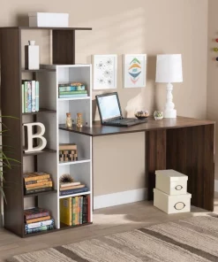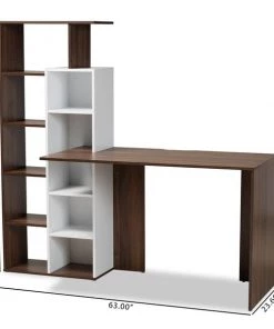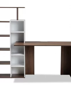 Redesign your home office with the outstanding Rowan desk. Made in Malaysia, the Rowan is crafted from sturdy wood displaying a contemporary two-tone finish of white and walnut brown. The side of the desk is outfitted with ten shelves to help you easily organize and decorate your workspace. Requiring assembly, the Rowan utilizes an open design to provide more room for all your electronic devices and accessories. A fantastic solution to reduce clutter, the Rowan desk adds handy storage to any space.