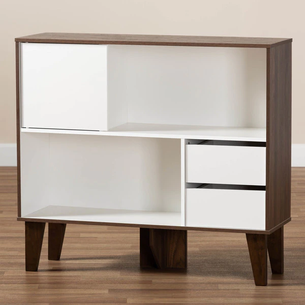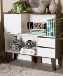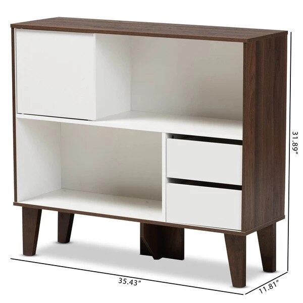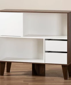 Upgrade any corner in your home with the quaint design of the Senja bookcase. This wood bookcase features clean lines and a two-tone white and walnut brown finish for a cool, contemporary look. Two shelves provide space to display books and knick-knacks, while two drawers provide room to store chargers and miscellaneous items. Its compact size makes it well suited for small spaces. The Senja bookcase requires assembly.