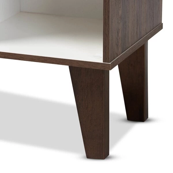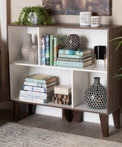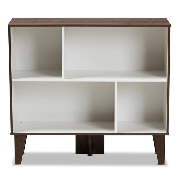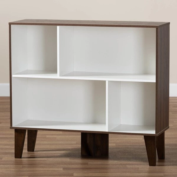 Upgrade any corner in your home with the quaint design of the Senja bookcase. This wood bookcase features clean lines and a two-tone white and walnut brown finish for a cool, contemporary look. Two tiers are divided into four compartments, providing a unique space to display all your favorite books and knick-knacks. Its compact size makes it well suited for small spaces. The Senja bookcase requires assembly.