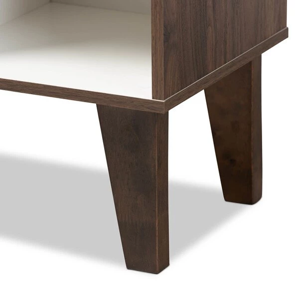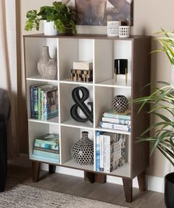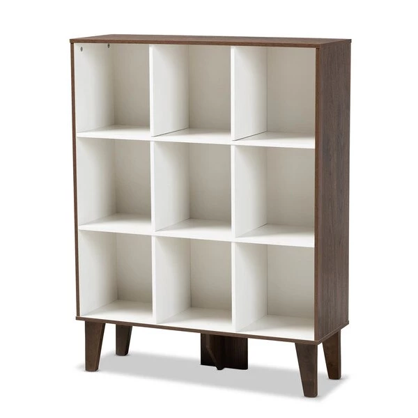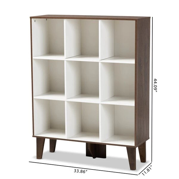 Upgrade any corner in your home with the quaint design of the Senja bookcase. This wood bookcase features clean lines and a two-tone white and walnut brown finish for a cool, contemporary look. Three tiers are divided into nine compartments, providing ample space to display all your favorite books and knick-knacks. Its compact size makes it well suited for small spaces. The Senja bookcase requires assembly.