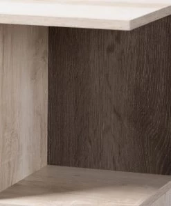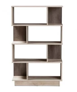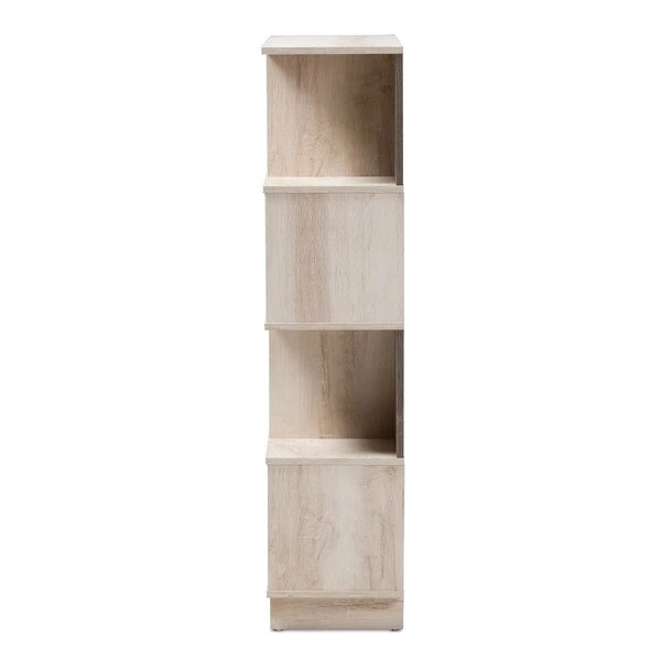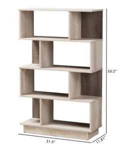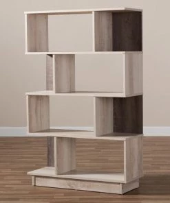 The Teagan bookcase makes it easy to imagine countless possibilities for display and organization. The modern and contemporary-inspired design incorporates rustic elements into its staggered, geometric layout. The Teagan is finished in a weathered, light oak, contrasted with the back panels of the closed display compartments in a weathered brown. The bookcase features four layers of shelves, each with a wider open space, and a closed edge compartment. This opens up the possibilities for storage solutions and creative decor display options. This charming and modern shelf will add a delightful energy to your livingroom, guest room, bedroom, or even a home or private office. The Teagan requires assembly.