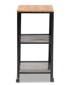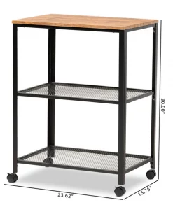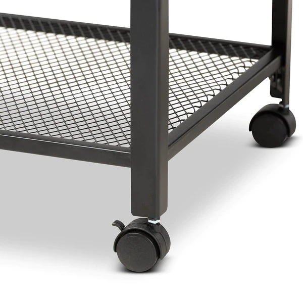 Bring your barware to any corner of your house with the Verna bar cart. Based on your liking, the Verna bar cart can easily switch from swivel wheels to stationary rubber feet in just minutes. Finished in a crisp black powder coating, this bar cart floats two mesh shelves on a minimalist frame. To complete the look, the Verna features an oak brown finished top. The Verna bar cart requires assembly.