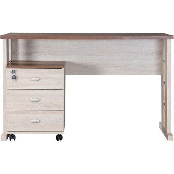Our Woodrow Writing Desk definitely has the “write” stuff. Efficient, right-angled design looks clean, precise and completely contemporary. This discount office-furniture item also boasts twin-toned Sonoma-oak finishing for a refined appearance. Includes a three-drawer rolling chest with metal pulls that tucks neatly under the desktop.