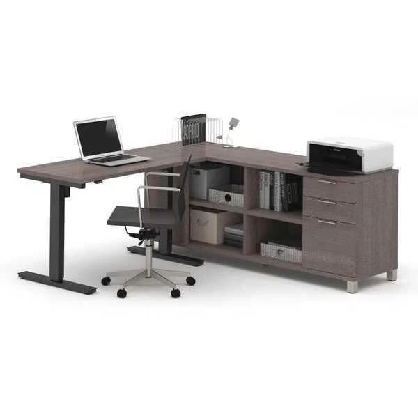 L-Desk with Electric Adjustable Table, Pro-Linea Series, Overall Width 71 7/64 in, Height Range 28 in to 45 in, Overall Depth 67 7/64 in, Color Base Bark Gray, Color Top Bark Gray, Base Material Metal, Top Material Melamine, Assembly Required, Standards ANSI/BIFMA, Includes 110V Mechanism