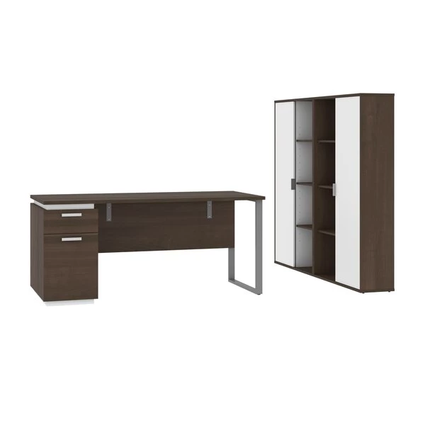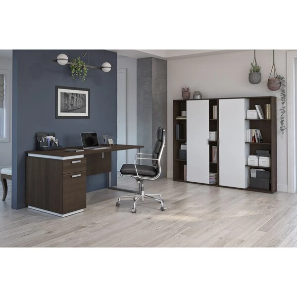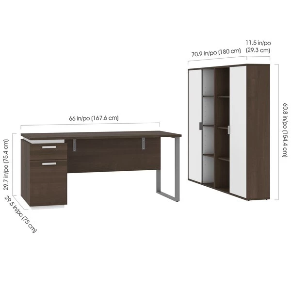 The Aquarius collection provides solutions for organizing your office in style. With its clean lines and metal accents, the contemporary pieces will help you get that wow effect to impress clients and employees alike. Desk: 66" W x 29.5" H x 29.6" D. Offers 1 utility drawer (12. 1" W x 2. 2" H x 15" D) and 1 file drawer (12. 1 W x 8. 75" H x 15" D) with letter/legal filing system. Drawers features full-extension ball-bearing slides for smooth operation. Durable 1" commercial grade work surface. Solid U-shaped steel leg. Leg levelers to adapt to any floor irregularities. Finished back. Made from high-density commercial-grade particle board, compliant with CARB phase 2. The desk meets or exceeds ANSI/BIFMA performance standards. Top can support up to 150 lb. Each Bookcase: 35.4" W x 11.5" D x 60.8" H. This cabinet is ideal for saving space in tight areas. Interior is divided vertically into 2 sections (16. 7" W) with 3 adjustable shelves each to increase storage possibilities. The sliding door allows efficient space utilization. Leg levelers to adapt to any floor irregularities. Made from high-density commercial-grade particle board, compliant with CARB phase 2. The cabinet meets or exceeds ANSI/BIFMA performance standards.