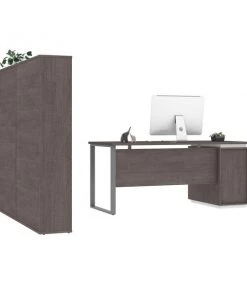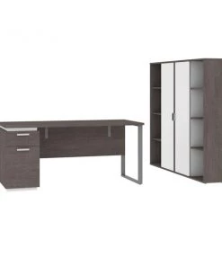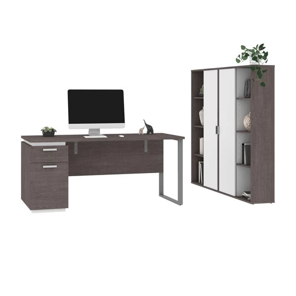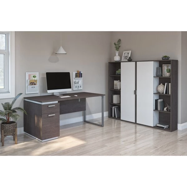The Aquarius collection provides solutions for organizing your office in style. With its clean lines and metal accents, the contemporary pieces will help you get that wow effect to impress clients and employees alike. Desk: 66" W x 29.5" H x 29.6" D. Offers 1 utility drawer (12. 1" W x 2. 2" H x 15" D) and 1 file drawer (12. 1 W x 8. 75" H x 15" D) with letter/legal filing system. Drawers features full-extension ball-bearing slides for smooth operation. Durable 1" commercial grade work surface. Solid U-shaped steel leg. Leg levelers to adapt to any floor irregularities. Finished back. Made from high-density commercial-grade particle board, compliant with CARB phase 2. The desk meets or exceeds ANSI/BIFMA performance standards. Top can support up to 150 lb. Each Bookcase: 35.4" W x 11.5" D x 60.8" H. This cabinet is ideal for saving space in tight areas. Interior is divided vertically into 2 sections (16. 7" W) with 3 adjustable shelves each to increase storage possibilities. The sliding door allows efficient space utilization. Leg levelers to adapt to any floor irregularities. Made from high-density commercial-grade particle board, compliant with CARB phase 2. The cabinet meets or exceeds ANSI/BIFMA performance standards.
