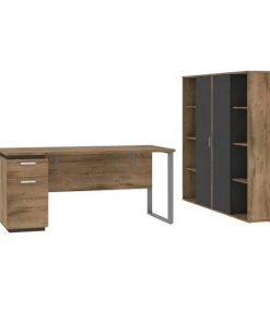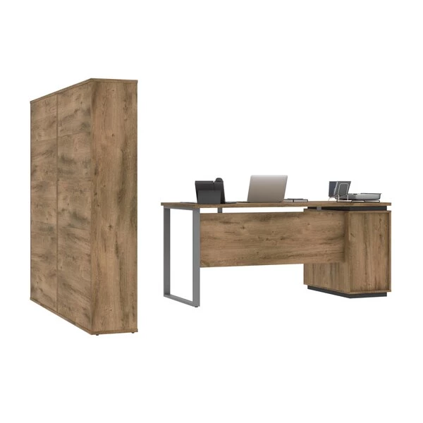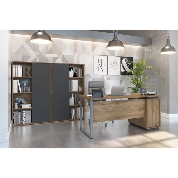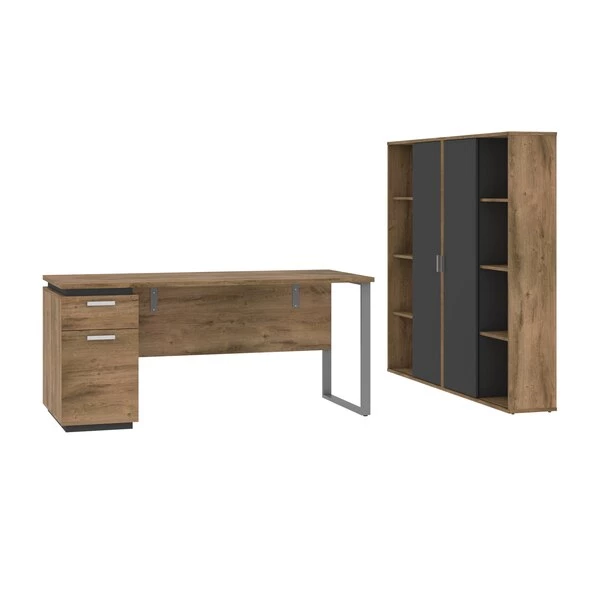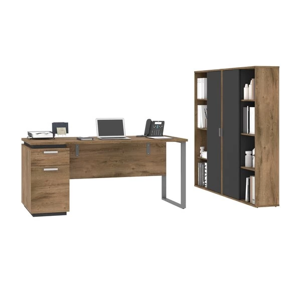 The Aquarius collection provides solutions for organizing your office in style. With its clean lines and metal accents, the contemporary pieces will help you get that wow effect to impress clients and employees alike. Desk: 66" W x 29.5" H x 29.6" D. Offers 1 utility drawer (12. 1" W x 2. 2" H x 15" D) and 1 file drawer (12. 1 W x 8. 75" H x 15" D) with letter/legal filing system. Drawers features full-extension ball-bearing slides for smooth operation. Durable 1" commercial grade work surface. Solid U-shaped steel leg. Leg levelers to adapt to any floor irregularities. Finished back. Made from high-density commercial-grade particle board, compliant with CARB phase 2. The desk meets or exceeds ANSI/BIFMA performance standards. Top can support up to 150 lb. Each Bookcase: 35.4" W x 11.5" D x 60.8" H. This cabinet is ideal for saving space in tight areas. Interior is divided vertically into 2 sections (16. 7" W) with 3 adjustable shelves each to increase storage possibilities. The sliding door allows efficient space utilization. Leg levelers to adapt to any floor irregularities. Made from high-density commercial-grade particle board, compliant with CARB phase 2. The cabinet meets or exceeds ANSI/BIFMA performance standards.