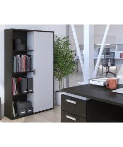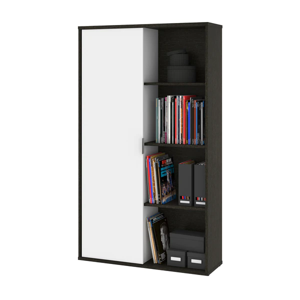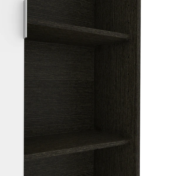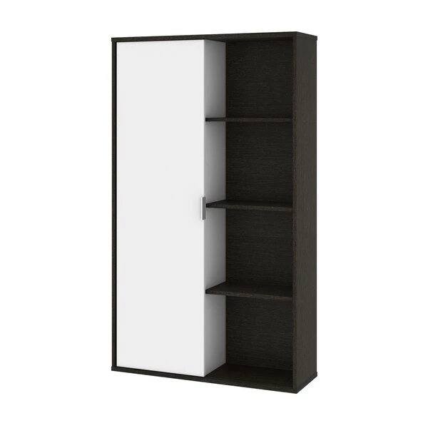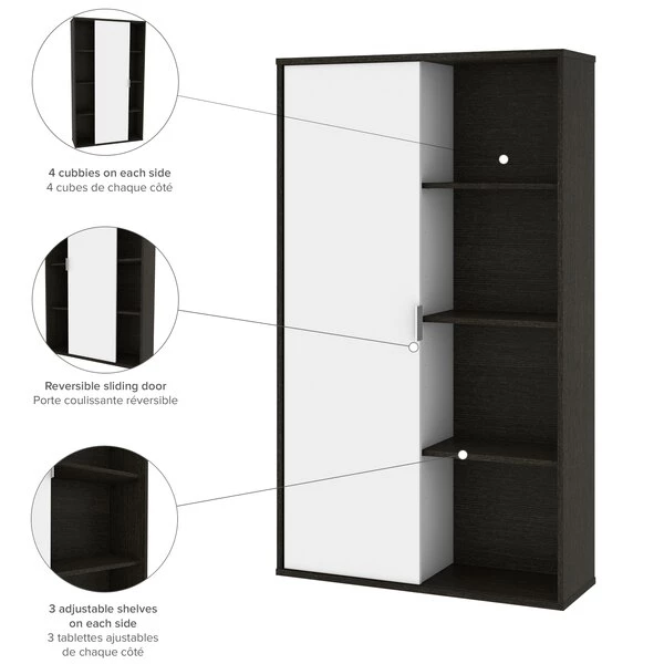 The Aquarius collection provides solutions for organizing your office in style. With its clean lines and metal accents, the contemporary pieces will help you get that wow effect to impress clients and employees alike. This bookcase is ideal for saving space in tight areas. Interior is divided vertically into 2 sections (16. 7" W) with 3 adjustable shelves each to increase storage possibilities. The sliding door allows efficient space utilization. Leg levelers to adapt to any floor irregularities. Made from high-density commercial-grade particle board, compliant with CARB phase 2. The bookcase meets or exceeds ANSI/BIFMA performance standards.