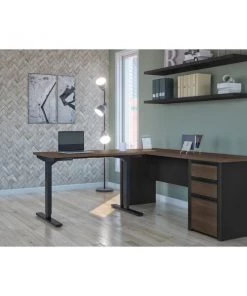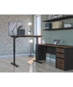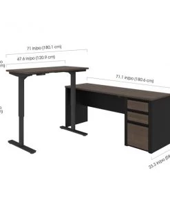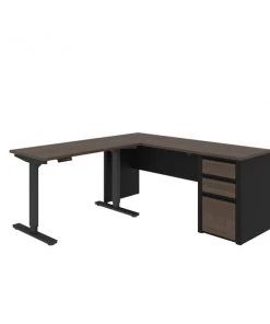 Connexion is a contemporary and durable collection that features a wide variety of configuration options that will adapt to your specific needs. The desk is made of a durable 1" commercial grade work surface with melamine finish that resist scratches, stains and wear. The electric mechanism allows you to quickly and quietly adjust the height of the table from 28" to 45". The control button is located on the front edge of the work surface for an easy access. Voltage : 110V. The L-Desk features an impact resistant PVC edge, classic moldings and a modesty panel on the credenza. Grommet is available on the credenza for efficient wire management. The pedestal offers two utility drawers and one file drawer with letter/legal filing system. Drawers on ball-bearing slides for smooth and quiet operation. One lock secures bottom two drawers. The credenza and the height adjustable table meet or exceed ANSI/BIFMA performance standards. The station is fully reversible.Overall dimensions : 71.1" x 70.9" x 30.4". Credenza : 71.1" x 22.4" x 30.4". Height adjustable table : 47.6" x 24" x 28" to 45".
