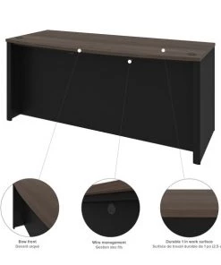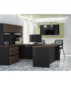 Connexion is a contemporary and durable collection that features a wide variety of configuration options that will adapt to your specific needs. The desk is made of durable 1" commercial grade work surface with melamine finish that resist scratches, stains and wear. The bow front desk offers additional space. It features an impact resistant thick PVC edge. Grommets and a rubber strip are available on the station for efficient wire management. The executive desk, the credenza, the hutch and the bridge meet or exceed ANSI/BIFMA performance standards. The hutch for credenza offers two flip up doors, large closed storage space, efficient wire management and two large paper shelves. The doors are fitted with strong lift up hardware. The oversized pedestal offers two file drawers with letter/legal filing system. The drawers and the keyboard shelf are on ball-bearing slides for a smooth and quiet operation. The station is fully reversible.