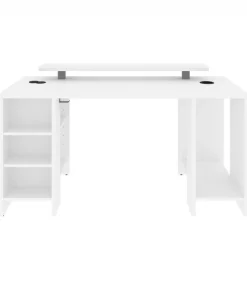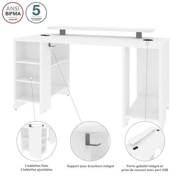 This Gaming Desk is well-built and sturdy enough to withstand intense gaming situations. The built-in monitor stand frees up your desktop and makes room for a keyboard and a large mousepad. Keep equipment within easy reach thanks to 1 fixed and 2 adjustable shelves on the front of the desk. Store larger items on the side of the desk where you can find 1 fixed and 1 adjustable shelf. Easily keep your computer tower out of the way with a large open storage area. With a built-in cup holder, headphone holder, and USB/power outlet, this desk is sure to help you create a top-notch gaming corner. Tested to meet ANSI/BIFMA quality standards for safety and performance.