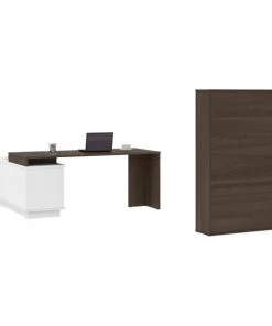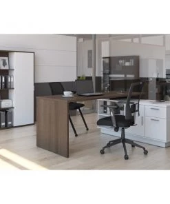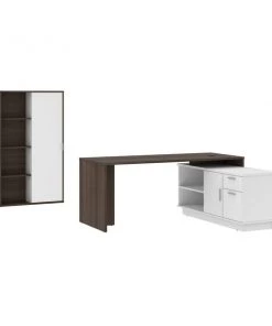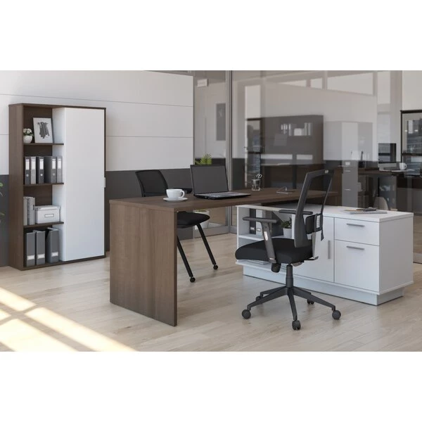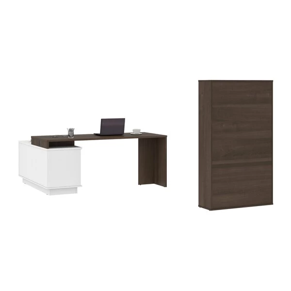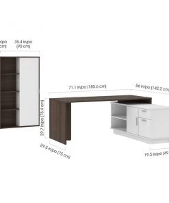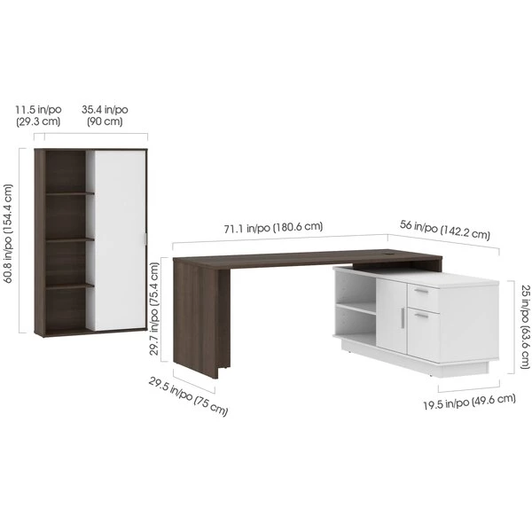 This desk is perfect if you are looking to maximize productivity and space in your office. It features a layered work surface to provide ample room for all your work activities. The stylish bookcase create a chic and sophisticated office environment. Desk: 71.1" W x 56" D x 29.6" H. Durable 1" commercial grade top surface with melamine finish that resists scratches, stains and wear. The layered work surface provides ample room for activities. Drawers on full-extension ball-bearing slides. Includes 1 grommet for wire management and 1 dual power/USB module. The credenza features 1 closed storage area with 1 adjustable shelf, 1 open storage area with 1 adjustable shelf, 1 utility drawer (12. 1" W x 2. 2" H x 15" D) and 1 file drawer (12. 1 W x 8. 75" H x 15" D) with letter/legal filing system. Sturdy construction. Leg levelers to adapt to any floor irregularities. Aluminum handles. The unit is fully reversible. Finished back. Made from high-density commercial-grade particle board compliant with CARB phase 2. Meets or exceeds ANSI/BIFMA performance standards. Excellent customer support. Assembly required (2 people). Bookcase: 35.4" W x 11.5" D x 60.8" H. This cabinet is ideal for saving space in tight areas. Interior is divided vertically into 2 sections (16. 7" W) with 3 adjustable shelves each to increase storage possibilities. The sliding door allows efficient space utilization. Leg levelers to adapt to any floor irregularities. Made from high-density commercial-grade particle board, compliant with CARB phase 2. The cabinet meets or exceeds ANSI/BIFMA performance standards.