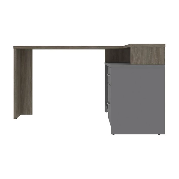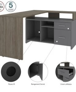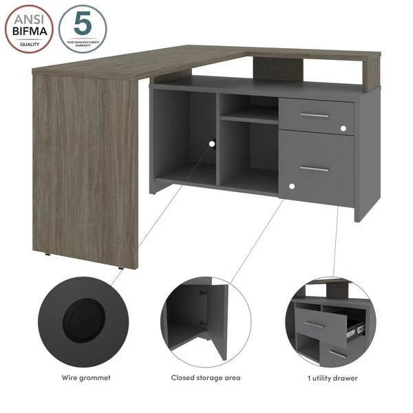 The durable work surface is designed to resist everyday damage to provide you with a professional-looking desk for many years to come. Easily keep your desk organized and conceal pesky wires and cables thanks to a handy wire grommet. Store small office supplies in the convenient box drawer or on the wide open shelf found just beneath the work surface. Use both open storage compartments and the closed storage area to store larger office equipment. The adjustable shelf in one of the open storage areas allows you to configure your storage space to meet your needs. Tested to meet ANSI/BIFMA quality standards for safety and performance.