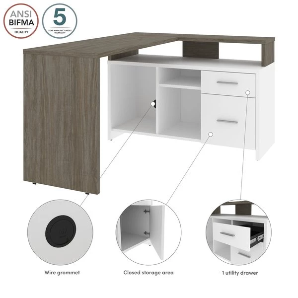The durable work surface is designed to resist everyday damage to provide you with a professional-looking desk for many years to come. Easily keep your desk organized and conceal pesky wires and cables thanks to a handy wire grommet. Store small office supplies in the convenient box drawer or on the wide open shelf found just beneath the work surface. Use both open storage compartments and the closed storage area to store larger office equipment. The adjustable shelf in one of the open storage areas allows you to configure your storage space to meet your needs. Tested to meet ANSI/BIFMA quality standards for safety and performance.