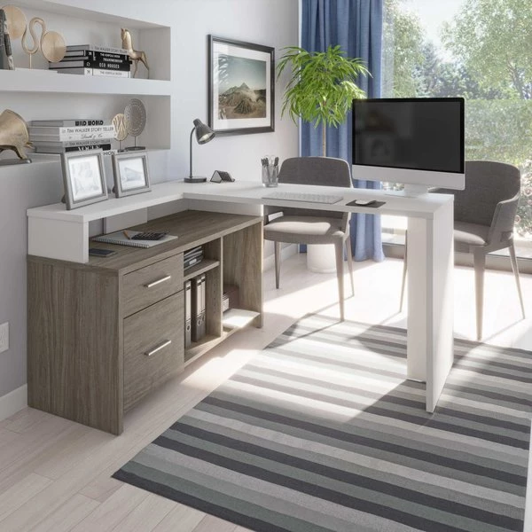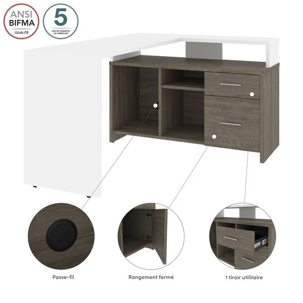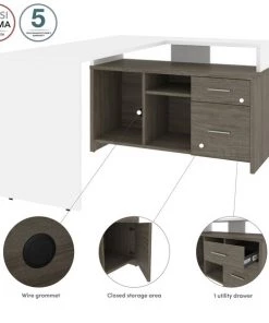 The durable work surface is designed to resist everyday damage to provide you with a professional-looking desk for many years to come. Easily keep your desk organized and conceal pesky wires and cables thanks to a handy wire grommet. Store small office supplies in the convenient box drawer or on the wide open shelf found just beneath the work surface. Use both open storage compartments and the closed storage area to store larger office equipment. The adjustable shelf in one of the open storage areas allows you to configure your storage space to meet your needs. Tested to meet ANSI/BIFMA quality standards for safety and performance.