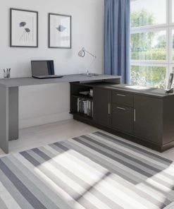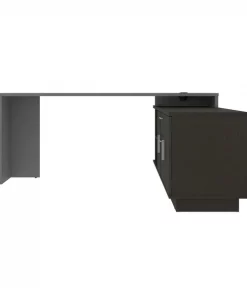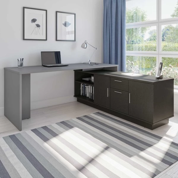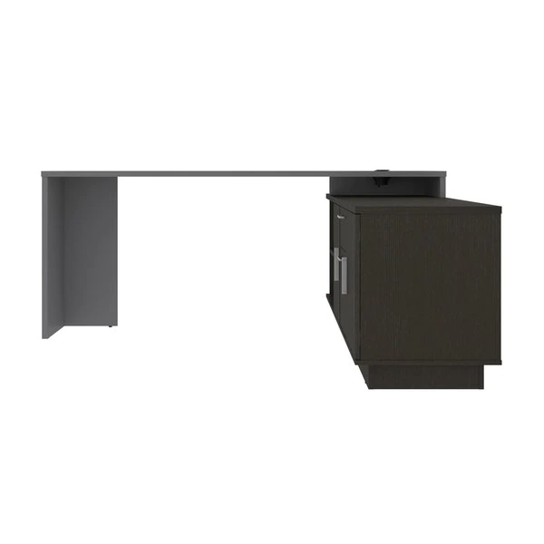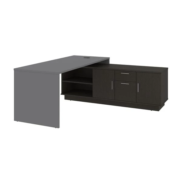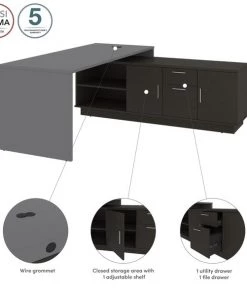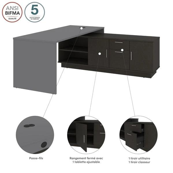 Transform your office into a center of organization and productivity with the Bestar Equinox L-Shaped Office Desk. With a layered work surface, this L-shaped desk provides ample room for all of your work activities. The laminated particle board desktop resists scratches, stains, and wear to last you for many years. With 2 closed and 2 open storage areas and a total of 3 adjustable shelves, the desk offers enough storage solutions for your office accessories. Easily keep your files and folders organized thanks to the utility drawer and letter/legal file drawer. The grommet can help you efficiently manage your cables. Keep your phone charged and on hand thanks to the built-in USB/power socket on the desktop. Meets ANSI/BIFMA standards for safety and performance. T