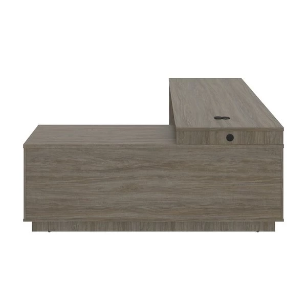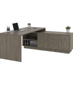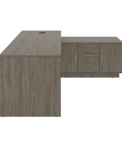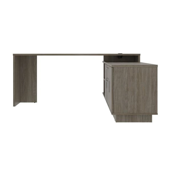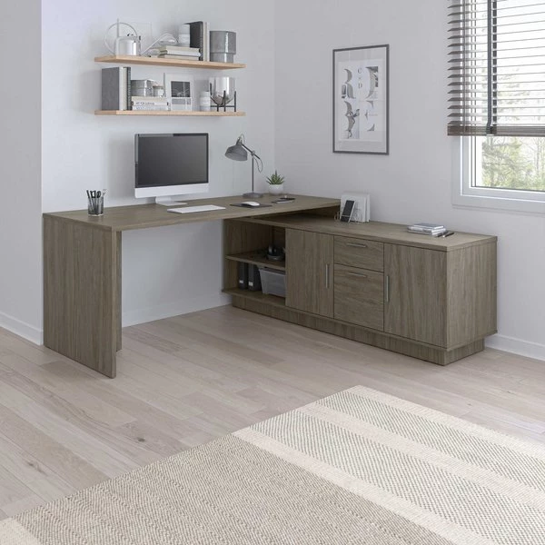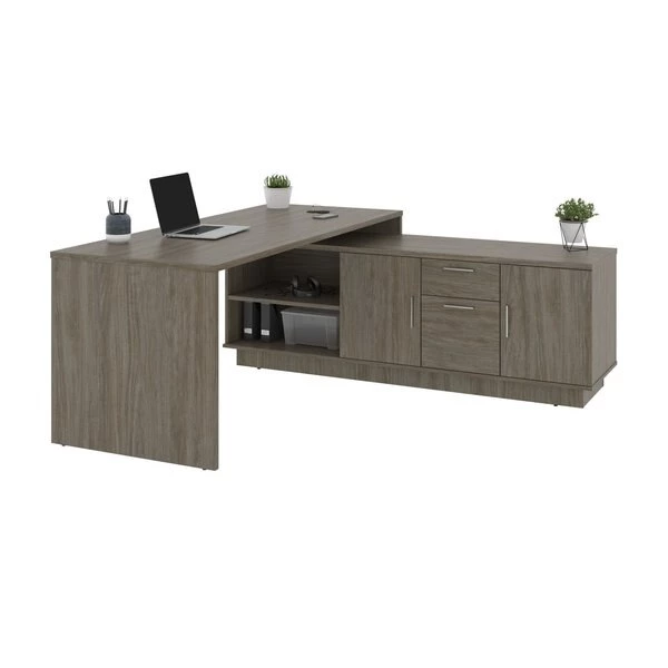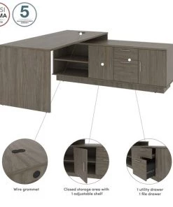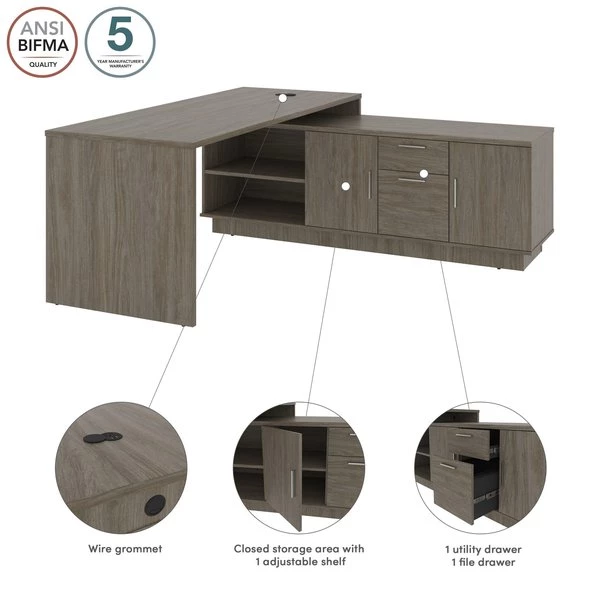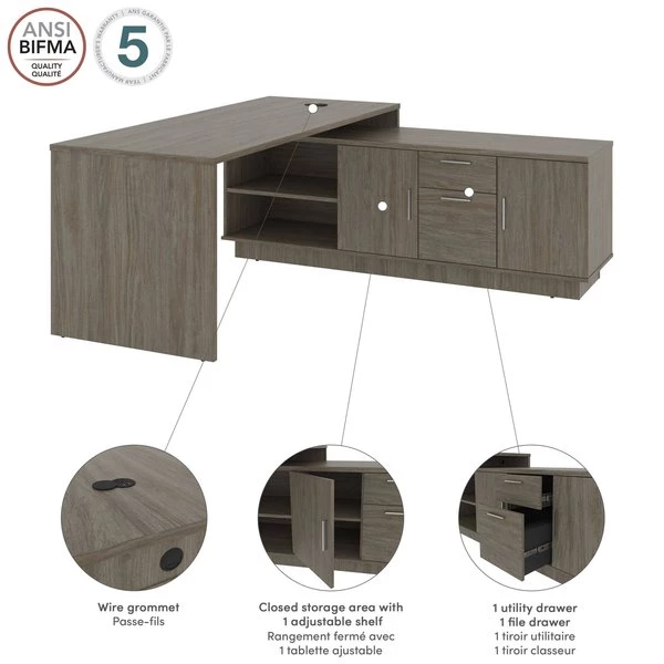 Transform your office into a center of organization and productivity with the Bestar Equinox L-Shaped Office Desk. With a layered work surface, this L-shaped desk provides ample room for all of your work activities. The laminated particle board desktop resists scratches, stains, and wear to last you for many years. With 2 closed and 2 open storage areas and a total of 3 adjustable shelves, the desk offers enough storage solutions for your office accessories. Easily keep your files and folders organized thanks to the utility drawer and letter/legal file drawer. The grommet can help you efficiently manage your cables. Keep your phone charged and on hand thanks to the built-in USB/power socket on the desktop. Meets ANSI/BIFMA standards for safety and performance. T